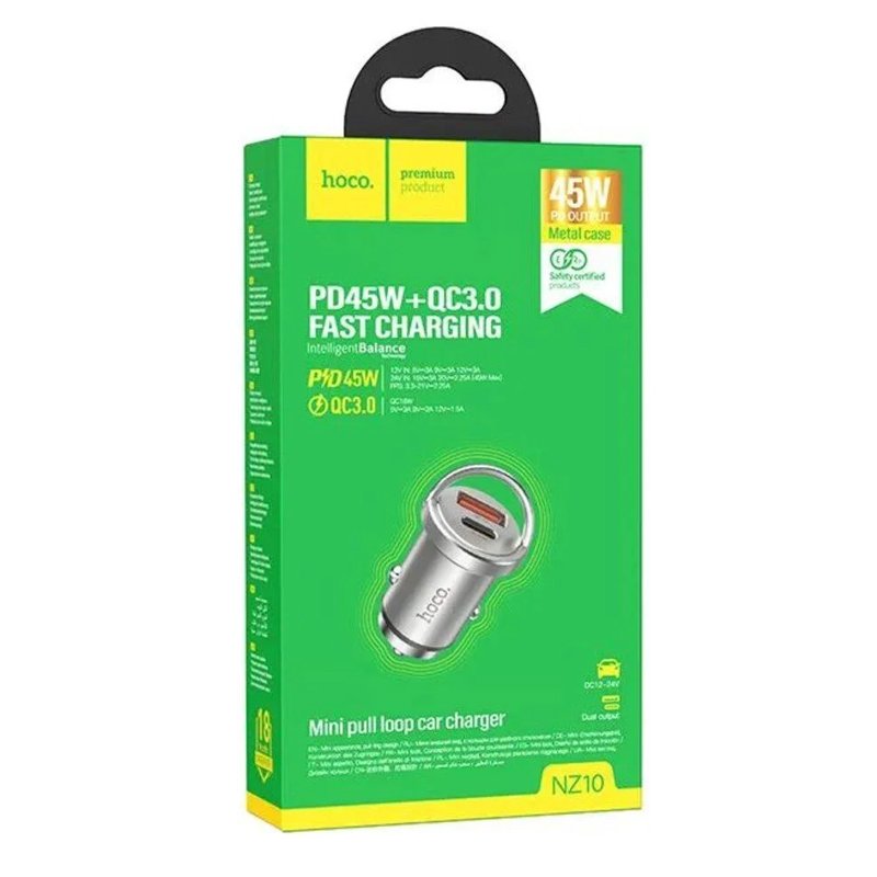 HOCO NZ10  — потужний та стильний автомобільний адаптер, виконаний у лаконічному сірому кольорі. Завдяки підтримці високої потужності та сучасних протоколів зарядки, він здатний швидко заряджати не лише смартфони, а й планшети та навіть деякі компактні ноутбуки безпосередньо у вашому авто