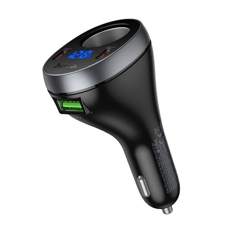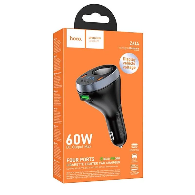 HOCO Z61A — потужний автомобільний зарядний пристрій із трьома портами (2×Type-C + 1×USB-A) та додатковим гніздом прикурювача, що дозволяє заряджати гаджети та одночасно живити автоаксесуари. Завдяки сумарній потужності 60 Вт та підтримці протоколів PD і QC, він здатний швидко заряджати смартфони та планшети, а вбудований LCD-дисплей допомагає контролювати напругу бортової мережі в реальному часі