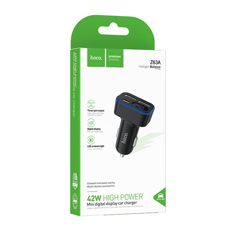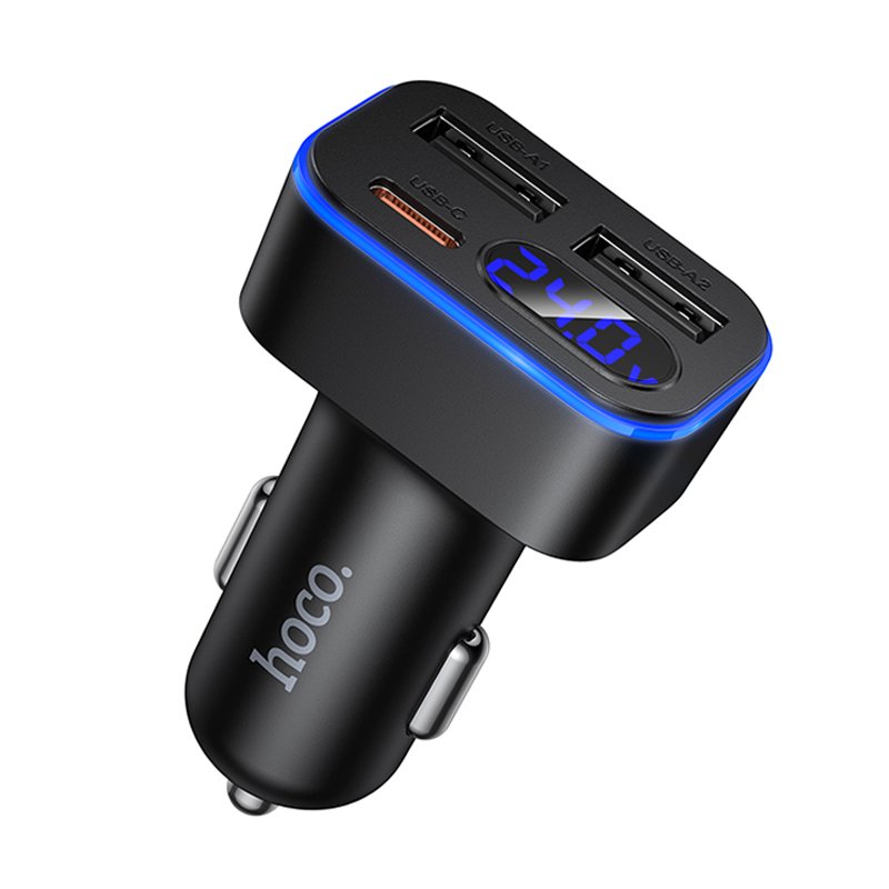HOCO Z63A — потужний автомобільний зарядний пристрій із трьома портами (1×Type-C + 2×USB-A), який дозволяє швидко та безпечно заряджати три гаджети одночасно. Він оснащений інтелектуальним LED-дисплеєм для моніторингу напруги та підтримує сучасні стандарти швидкої зарядки (PD 30W + QC 12W), що робить його універсальним рішенням для смартфонів та планшетів