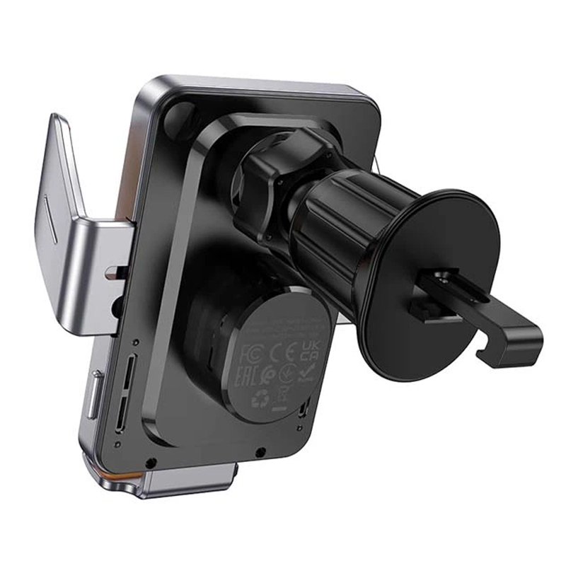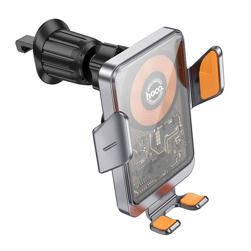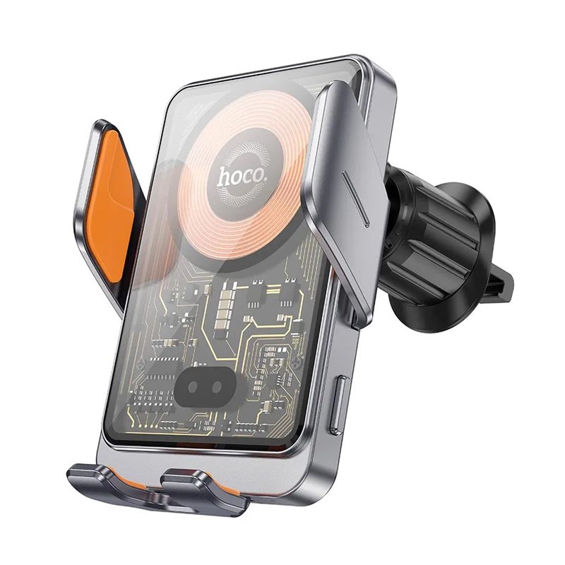 HOCO HW7 — інтелектуальний автомобільний тримач із функцією швидкої бездротової зарядки потужністю 15 Вт, оснащений сенсорним датчиком для автоматичного розсунення та затискання смартфона. Призначений для встановлення у вентиляційну решітку автомобіля