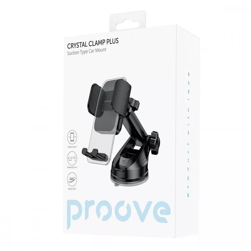 PROOVE CRYSTAL CLAMP PLUS SUCTION TYPE — тримач із вакуумним кріпленням (присоска) та механічним затискачем для смартфонів 4.7–6.9″, що забезпечує надійну фіксацію на торпедо або склі. Має обертання на 360°, корпус із ABS+силікону та м’які вставки для захисту смартфона від подряпин
