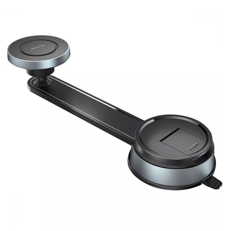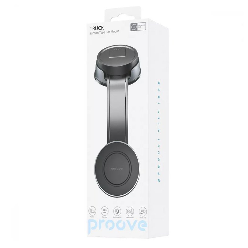 PROOVE TRUCK SUCTION TYPE MOUNT — універсальний тримач для смартфона з потужною вакуумною присоскою, що надійно кріпиться до лобового скла або панелі. Має регульований кут огляду та поворот на 360°, забезпечуючи стабільну фіксацію і зручне використання навігації під час руху