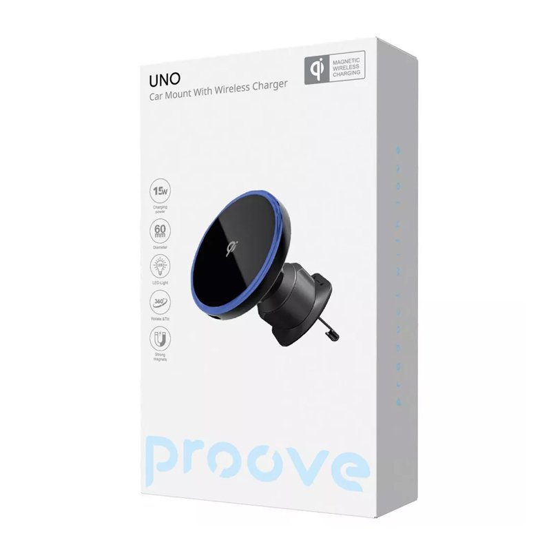 PROOVE UNO — компактний магнітний тримач із підтримкою бездротової зарядки 15W. Завдяки кріпленню в дефлектор та шарнірному механізму, гаджет завжди залишається в полі зору, не займаючи зайвого місця на панелі