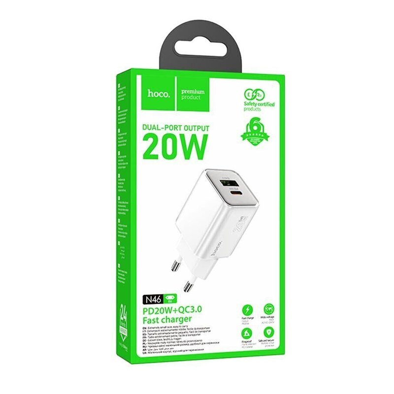 HOCO N46 – компактний і потужний мережевий зарядний пристрій із технологією GaN, що підтримує швидку зарядку PD 20W та QC3.0 для ефективного живлення різних гаджетів