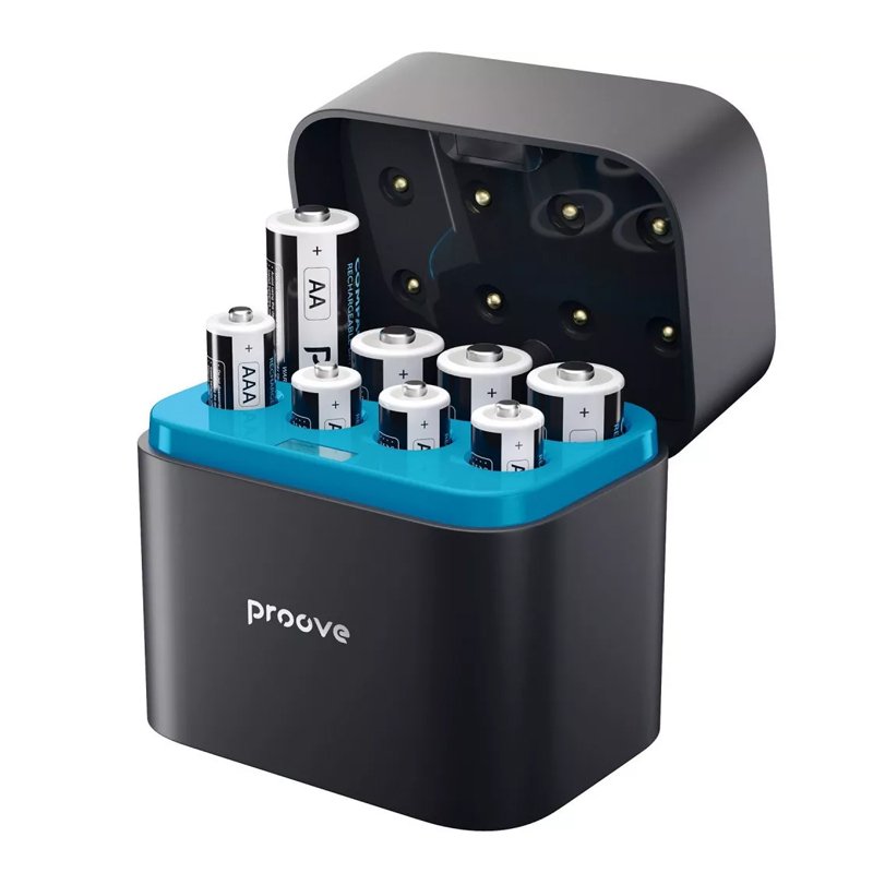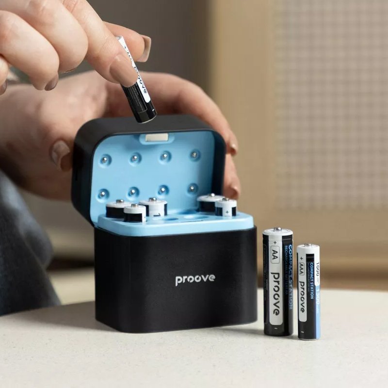 PROOVE COMPACT STATION 8PCS — комплект із зарядної станції та 8 літій-іонних батарейок (4×AA 3000 mWh + 4×AAA 1300 mWh) із можливістю одночасної зарядки через Type-C. Компактний кейс із LED-індикацією забезпечує до 1000 циклів перезарядки та зручне зберігання елементів живлення для побутових пристроїв