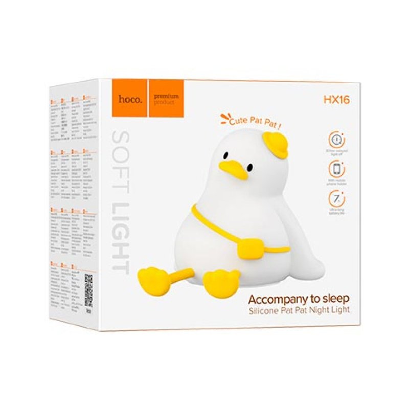 HOCO HX16 Duck— неймовірно милий та практичний дитячий нічник, виконаний у формі каченя. Завдяки м’якому силіконовому корпусу, він абсолютно безпечний для малюків: його можна стискати, обіймати та навіть кусати (матеріал не містить шкідливих речовин)