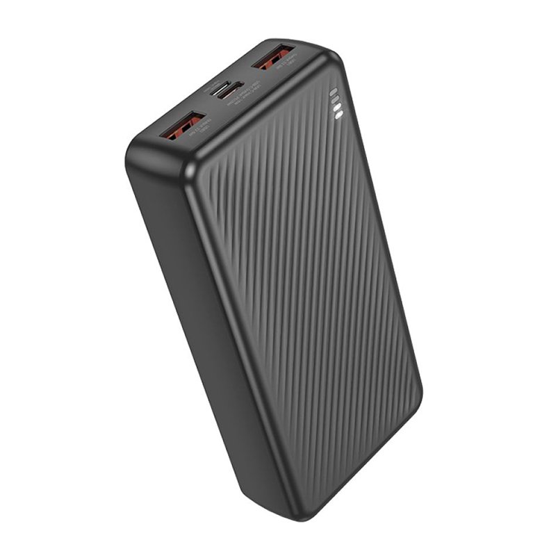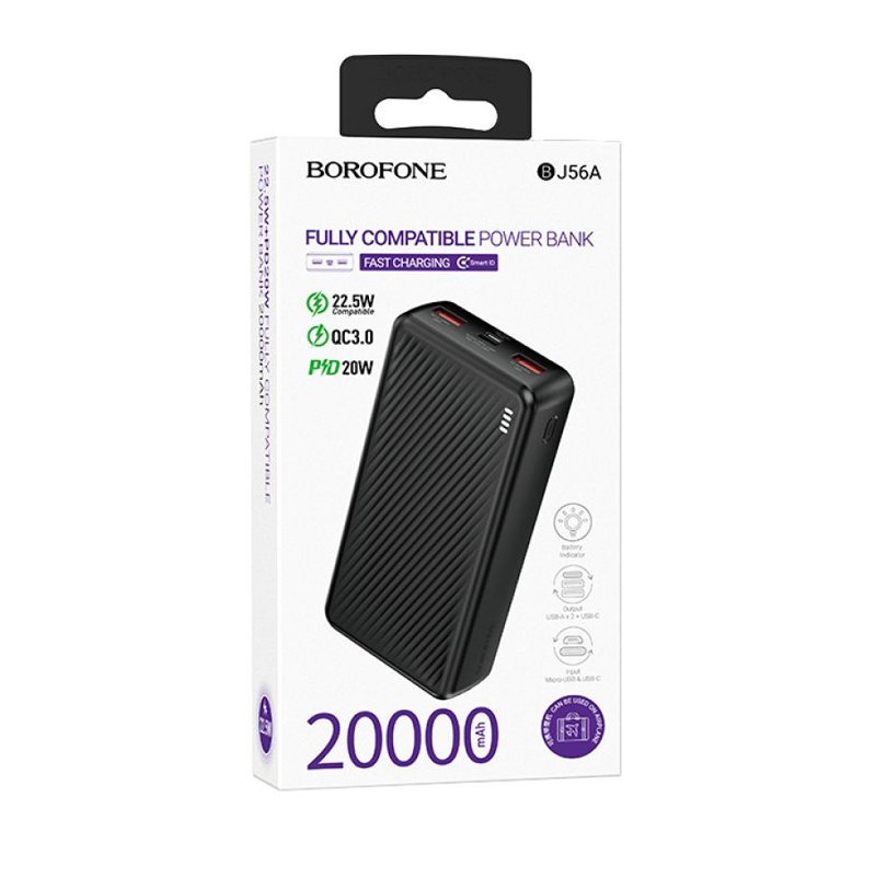 BOROFONE BJ56A 20000 mAh — потужний зовнішній акумулятор із трьома портами (2× USB-A + USB-C), підтримкою швидкого заряду QC 3.0 (22,5 Вт) та PD (20 Вт). Вхідні роз’єми: USB-C та micro-USB (обидва до ~18 Вт), корпус із ABS/PC, індикатор заряду LED, вага близько 408 г — знахідка для тривалих поїздок чи щоденного використання