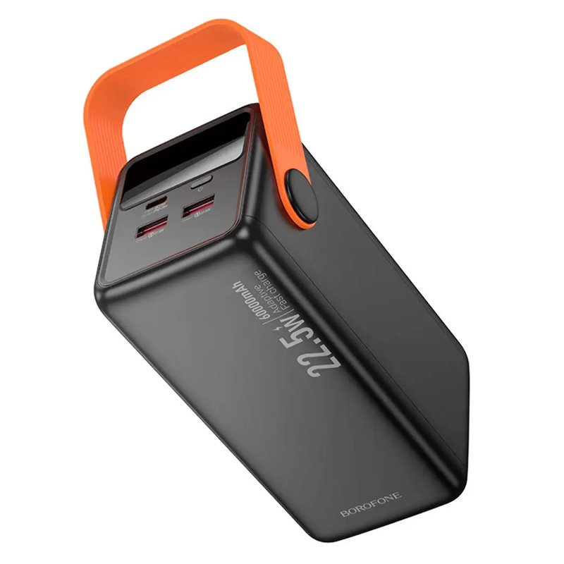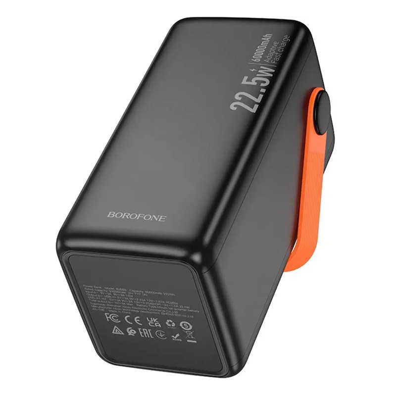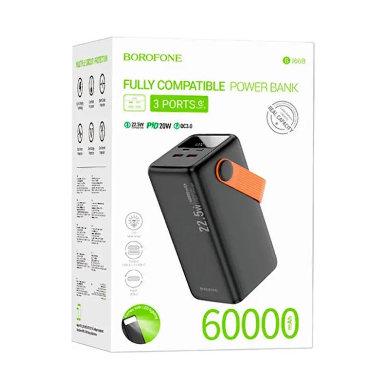 BOROFONE BJ66B 60000 mAh — надпотужний акумулятор для тривалого автономного користування, здатний багаторазово заряджати смартфони, планшети та інші пристрої. Підтримка швидкої зарядки 22.5W, кілька USB-портів та надійний корпус роблять його універсальним рішенням для подорожей і повсякденних потреб