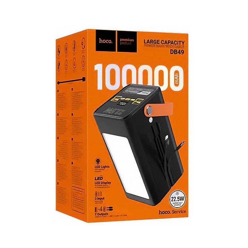 HOCO DB49 — надпотужний зовнішній акумулятор, ємністю 100000 мА/г, із підтримкою швидкої зарядки. Ідеально підходить для тривалих подорожей і роботи в польових умовах, дозволяючи багаторазово заряджати смартфони, планшети чи інші гаджети