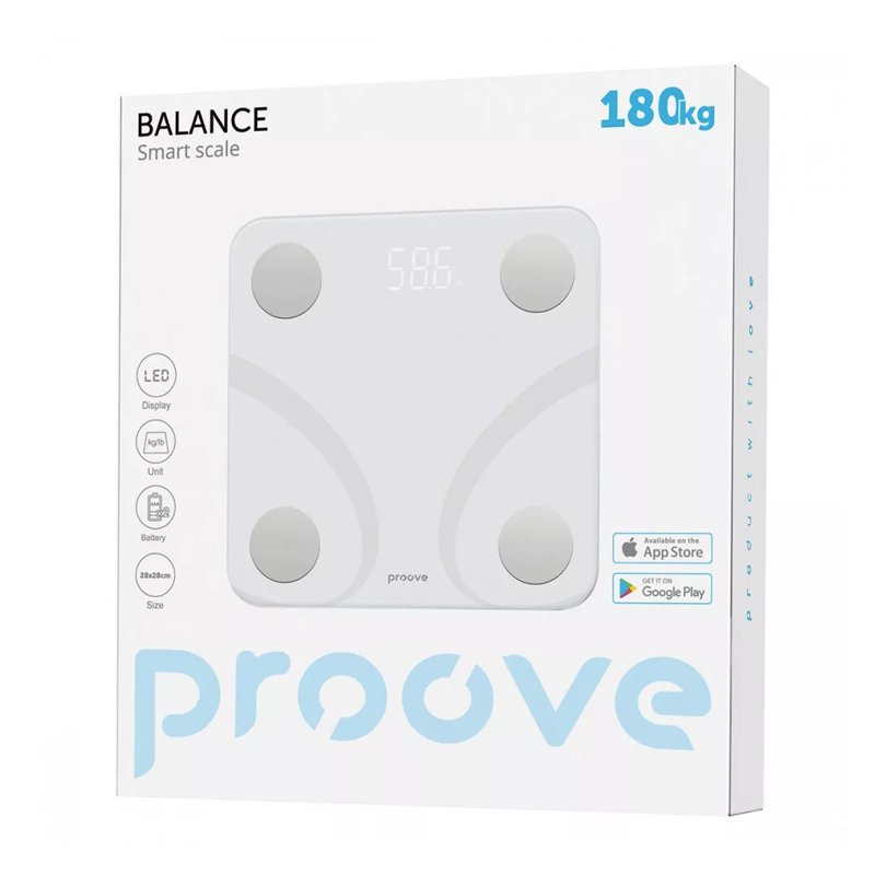 PROOVE BALANCE — розумні електронні ваги з Bluetooth-синхронізацією зі смартфоном, що вимірюють вагу та до 12 показників тіла (жир, м’язову масу, ІМТ тощо). Міцна платформа із загартованого скла, LED-дисплей та максимальне навантаження до 180 кг забезпечують точні вимірювання та зручне використання