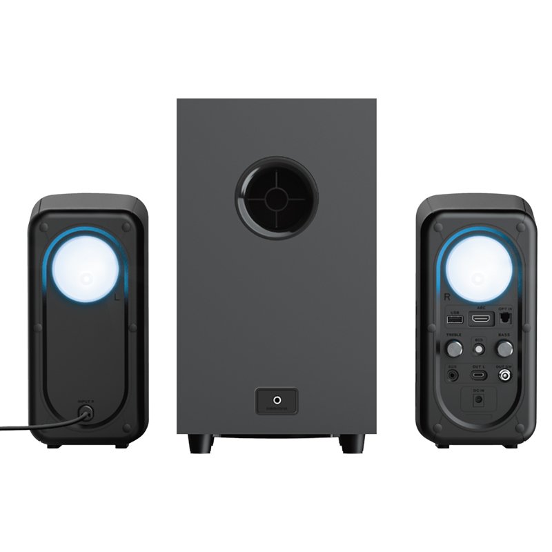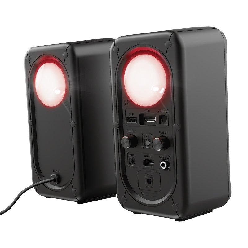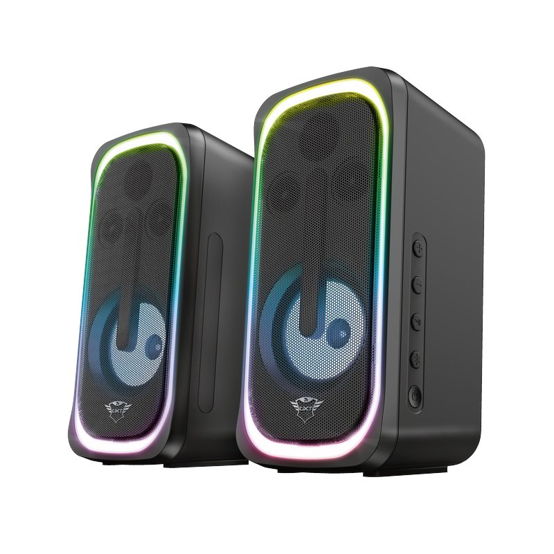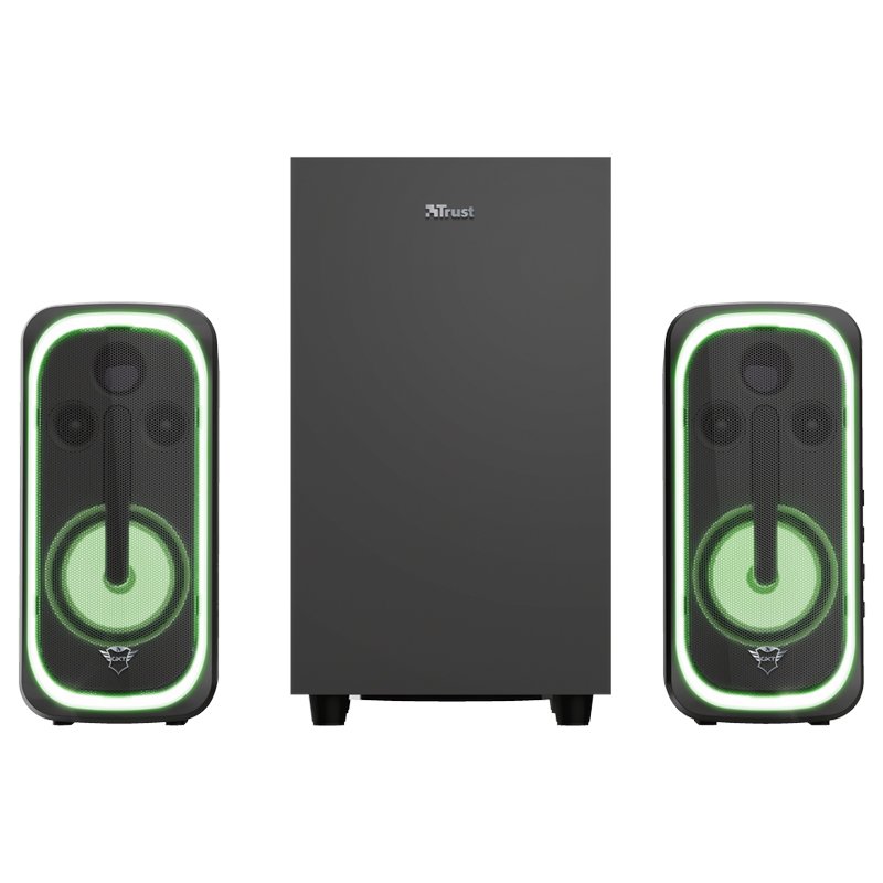 TRUST RUMAX 2.1 GXT 635 – потужна акустична система для геймерів з двома сателітами та сабвуфером, забезпечує об’ємний звук і яскраве підсвічування.