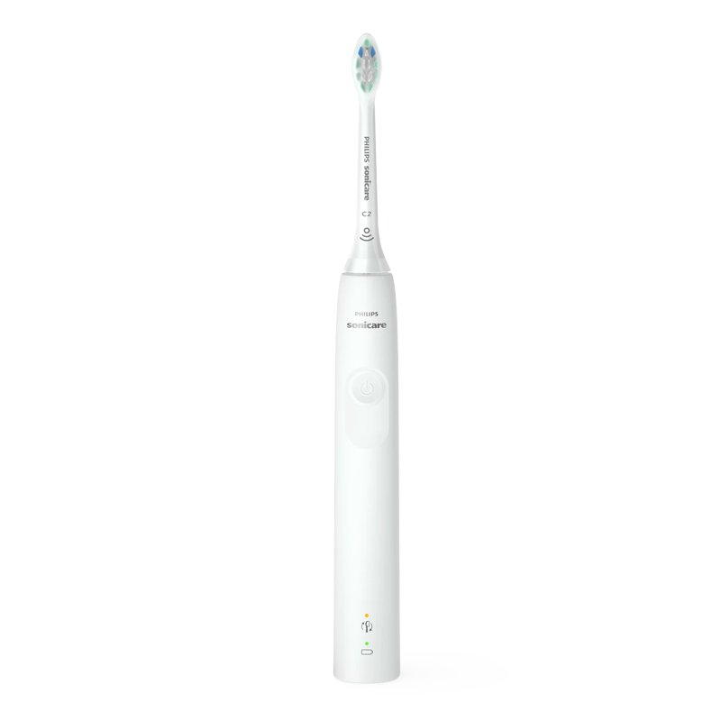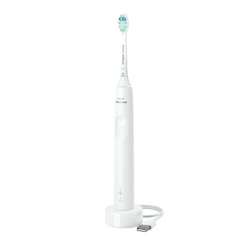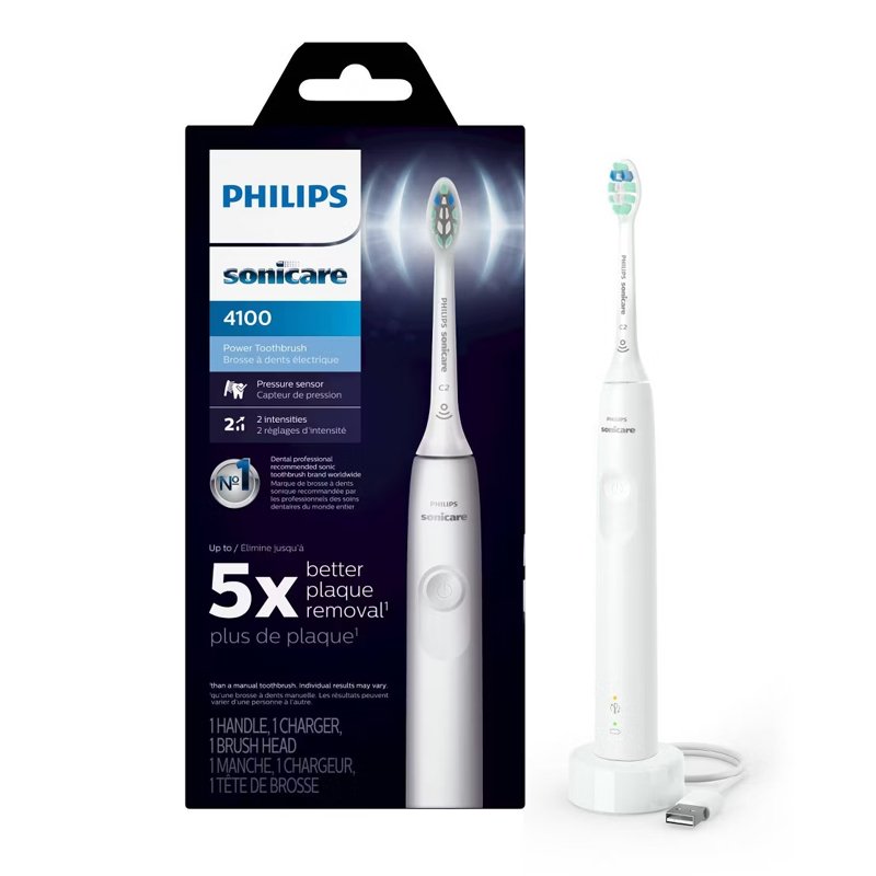 Видалення зубного нальоту та глибоке, ефективне чищення за допомогою технології Sonicare, яка видаляє в 5 разів більше нальоту, порівнюючи з ручною зубною щіткою. Технологія Sonicare м’яко подає воду між зубами, забезпечуючи миттєве ручне чищення всього за 2 хвилини. QuadPacer дає змогу дізнатися, коли ви витратили оптимальну кількість часу на кожну зону порожнини рота, а SmarTimer сигналізує про закінчення 2 хвилин. Датчик тиску блимає червоним кольором, нагадуючи про необхідність послабити навантаження, що допомагає запобігти рецесії ясен, а 2 параметри інтенсивності забезпечують комфортне чищення, що підходить саме вам. Перехід на електричне чищення може здатися серйозним кроком, але з цією щіткою ви будете в надійних руках. Її тонкий ергономічний дизайн і звична форма головки забезпечують усе необхідне для ефективного чищення. До комплекту входить 1 електрична зубна щітка Philips Sonicare 4100, 1 насадка Optimal Plaque Control (C2) і 1 кабель USB для заряджання ( мережевий адаптер до комплекту не входить).