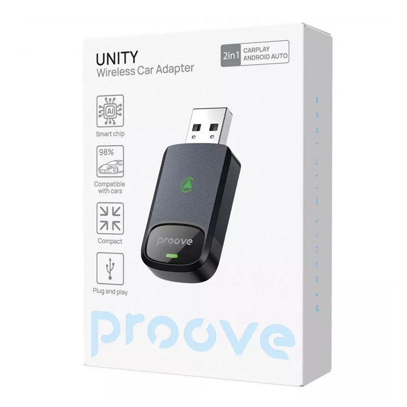 PROOVE UNITY 2-in-1 — компактний адаптер з підтримкою Apple CarPlay та Android Auto, який перетворює дротове підключення на повністю бездротове через Bluetooth. Забезпечує швидке з’єднання, стабільну роботу та зручний доступ до навігації, музики й дзвінків без зайвих кабелів