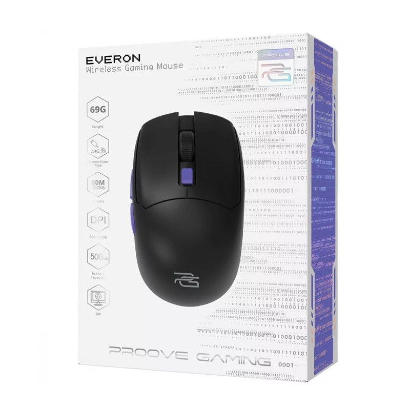 PROOVE GAMING EVERON — бездротова ігрова миша з чутливістю від 800 до 10000 dpi, яка має 6 кнопок та вбудований акумулятор ємністю 500 мА/г, що дозволяє неперервно використовувати мишу в бездротовому режимі протягом 140 годин