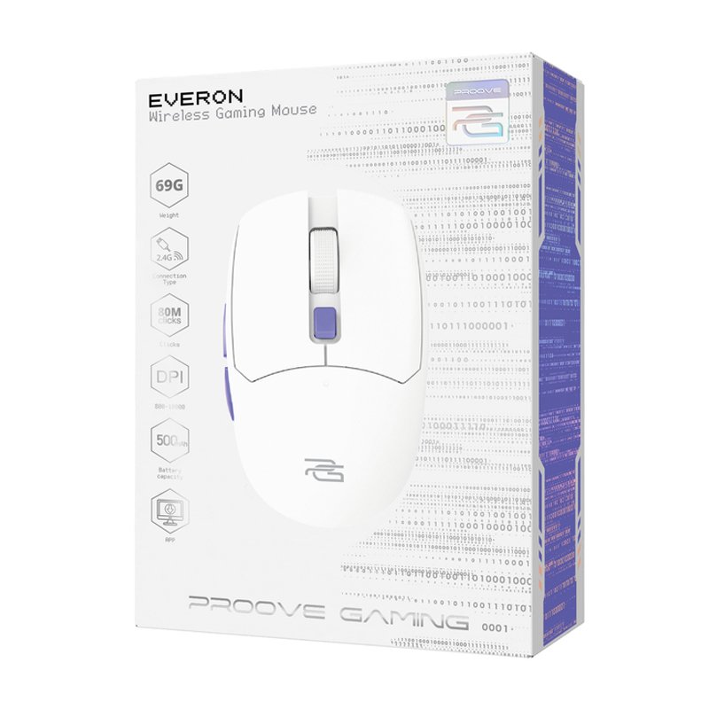 PROOVE GAMING EVERON — бездротова ігрова миша з чутливістю від 800 до 10000 dpi, яка має 6 кнопок та вбудований акумулятор ємністю 500 мА/г, що дозволяє неперервно використовувати мишу в бездротовому режимі протягом 140 годин