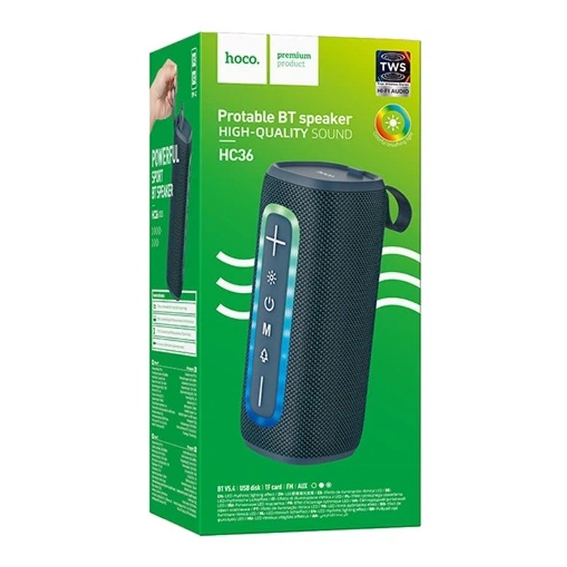 HOCO HC36 — бездротова Bluetooth-колонка з двома динаміками по 5 Вт (10 Вт сумарно), що забезпечує гучний стереозвук і стабільне підключення через Bluetooth 5.4. Підтримує режими Bluetooth, FM, USB, TF, AUX і TWS, має LED-підсвітку та акумулятор 1200 мА·год для роботи до 3 годин